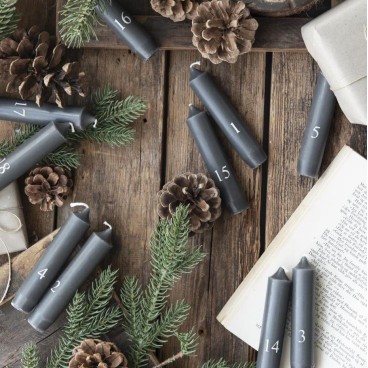 Flotte mørkegrå bedelys med hvide tal fra 1-24 fra Ib Laursen. En anderledes form for kalenderlys - du får 24 lys med hvert deres tal på. Se lysene i andre flotte farver, samt glasstagen med låg, som passer til bedelysene. Brændetid: ca. 4 timer.