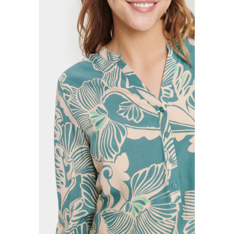 Lækker bluse, EdaSZ, i en flot støvet petroleums grøn med råhvide blomster og et lille twist af grønt, fra Saint Tropez. Blusen har lange ærmer med elastik rundt ved ærmerne, så du kan nemt trække ærmerne op, v-hals med 4 knapper, er lavet i en lækker blød kvalitet. Fås også som kjole.