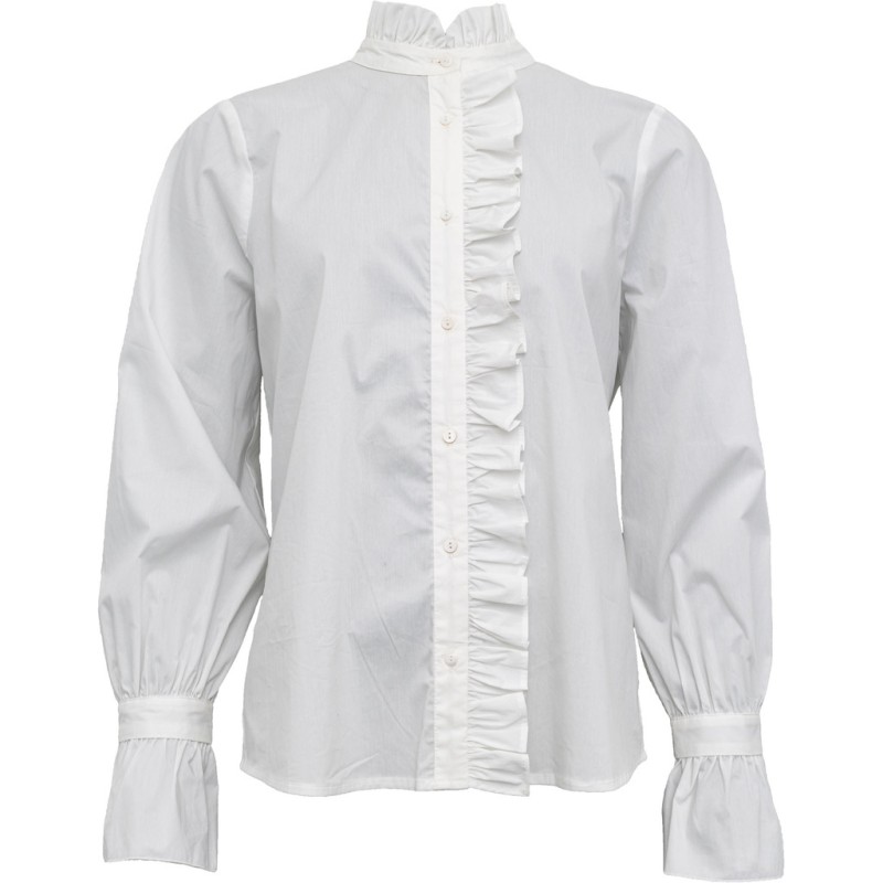Smuk og elegant hvid skjorte "Queen" fra Costamani. Skjorten er lavet i en lækker kvalitet med en fin lodret flæse krave, flæser ned langs knappelukningen og de fineste lidt trompet ærmer, grundet flæserne. En virkelig smuk skjorte særligt under en lækker blazer og til et par lækre bukser. Denne skjorte er smuk til hverdag og til festen.