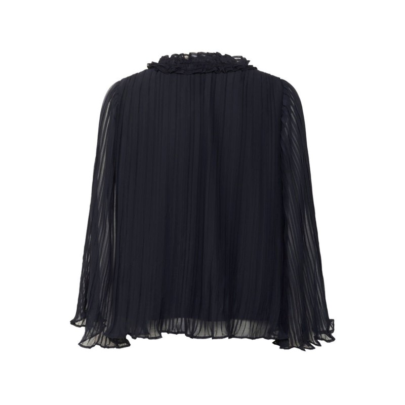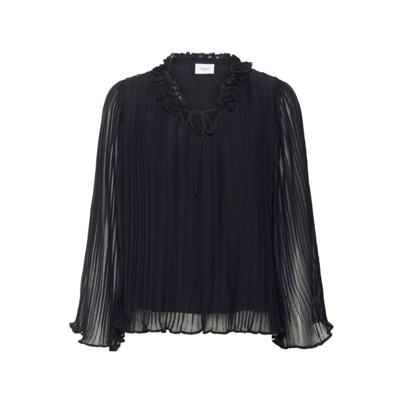 Bluse "NuriSZ" fra Saint Tropez i sort med elegant bindebånd. Den plisserede tekstur og let løse pasform giver et stilrent, luftigt udtryk. Blusen har lange, let gennemsigtige ærmer, delikat v-udskæring med feminine flæsedetaljer og bindebånd, der tilføjer et romantisk touch. Perfekt til både hverdag og festlige anledninger.