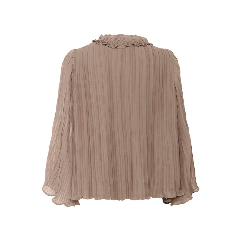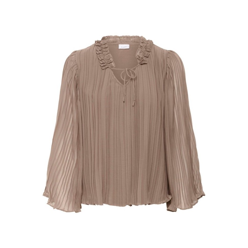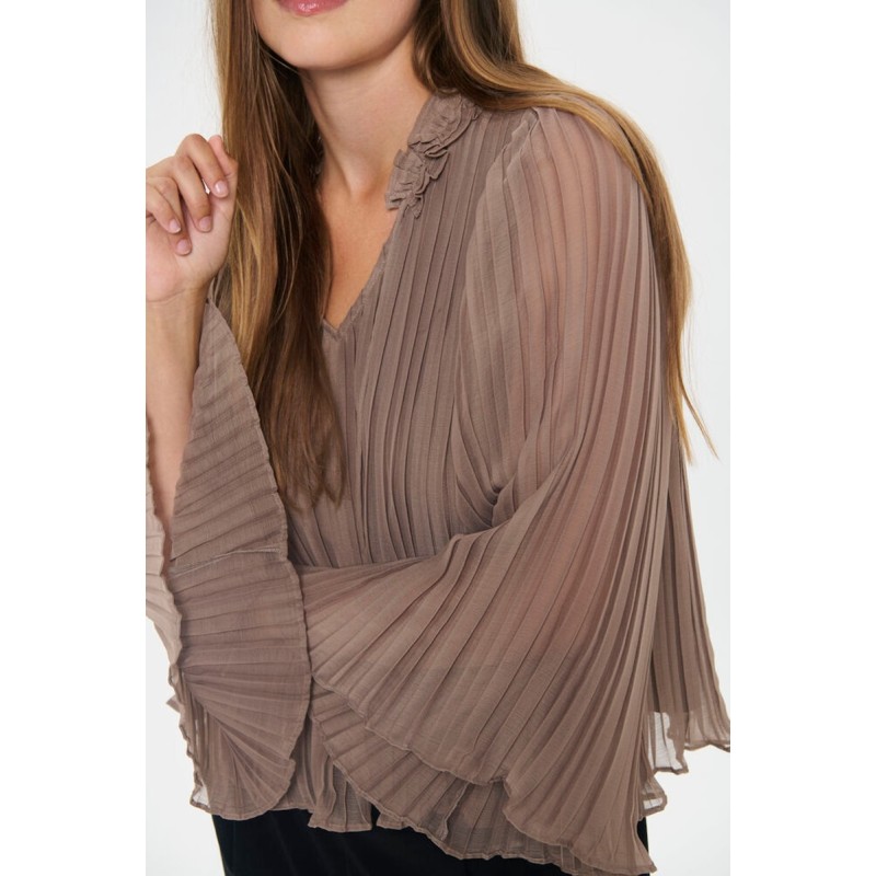 Elegant og feminin bluse "NuriSZ" fra Saint Tropez i en smuk nougat brun farve. Designet med fine flæsedetaljer ved v-udskæringen og et romantisk bindebånd. Den plisserede kvalitet kombineret med lange, let gennemsigtige ærmer giver et luftigt look med stil. Perfekt til både hverdag og festlige lejligheder – sofistikeret og let at style.