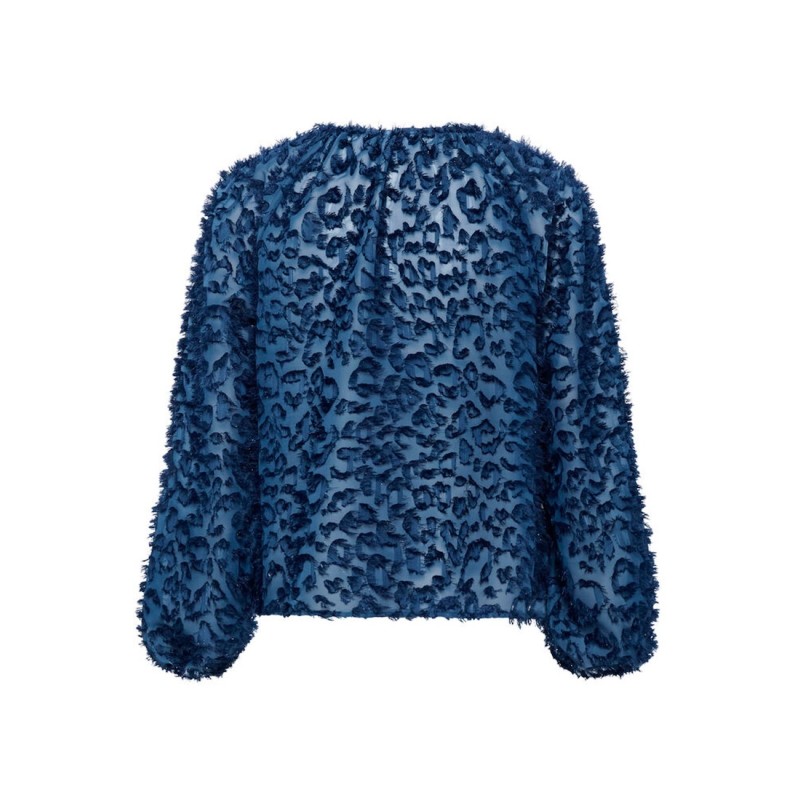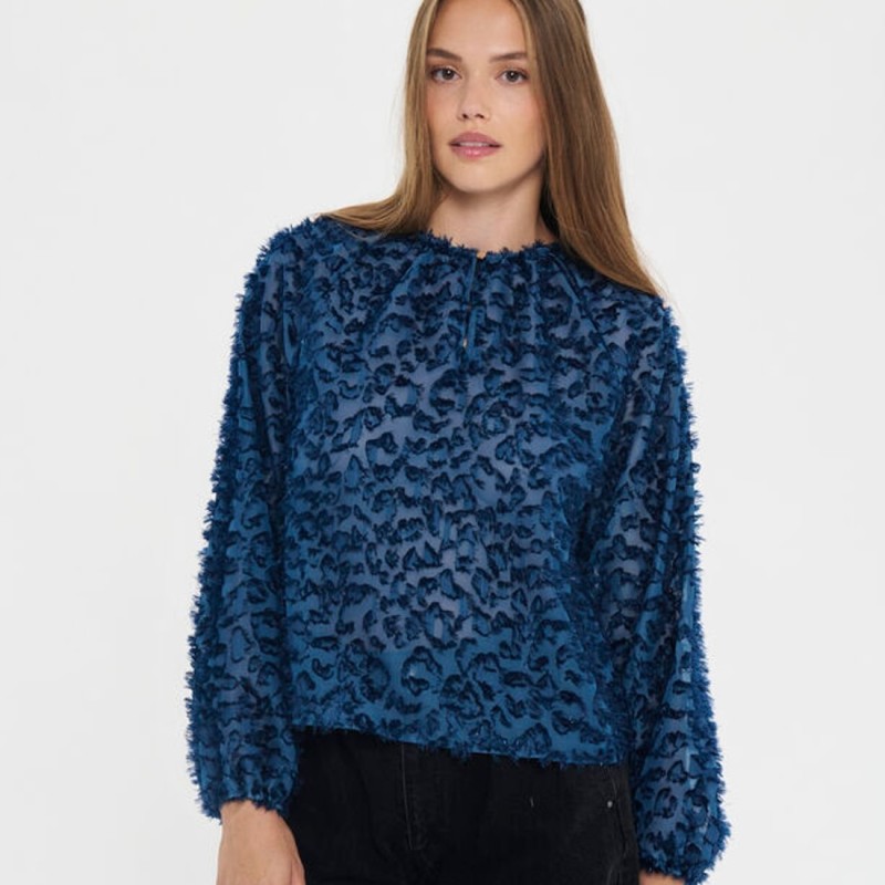 Elegant og stilfuld bluse i midnatsblå fra Saint Tropez. "NilsineSZ" har et diskret, tekstureret fjermønster samt glitrende tråde, der tilfører liv og spil til stoffet. Blusen har lange ærmer med let rynkede kanter, rund halsudskæring med knaplukning bagpå og en flatterende pasform. Går til hofterne – perfekt til både hverdag og fest.