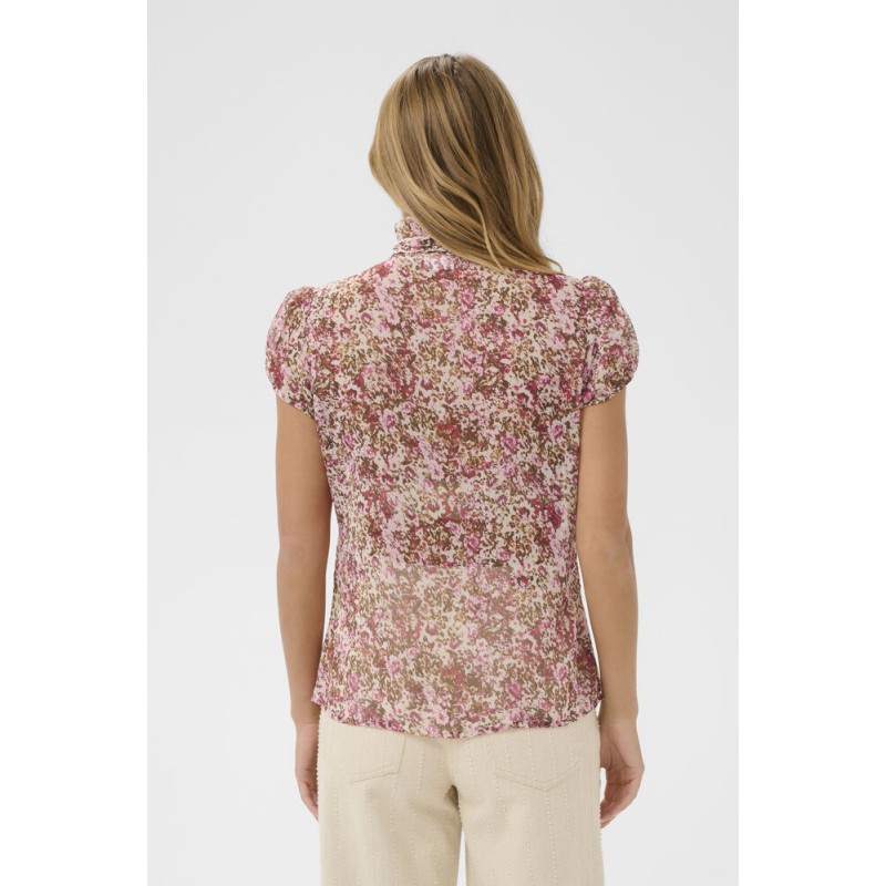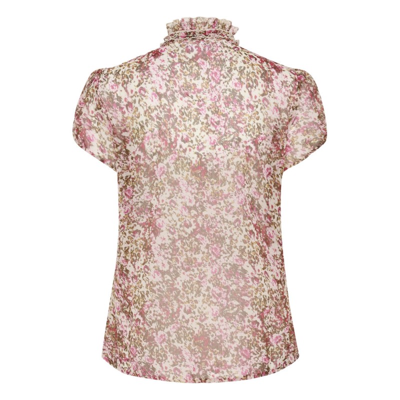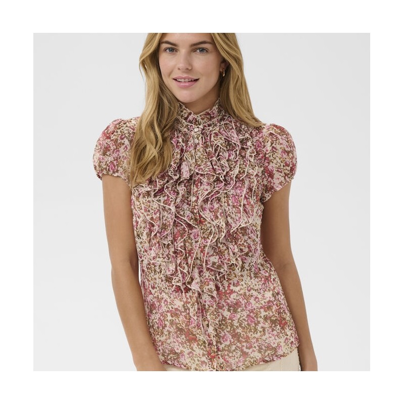 Skjorte LiljaSZ fra Saint Tropez i et smukt miks af pink og army, der skaber et unikt, varmt og sommerligt udtryk. Modellen har høj hals med lagdelte flæser foran, korte let puffede ærmer og en lige, afslappet pasform. Det lette, transparente materiale giver blusen et feminint look. Blusen er til den lille side.