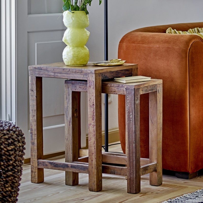 Galen sidebord/skammel-sættet fra Bloomingville består af 2 unikke borde fremstillet i genanvendt træ med en smuk, vokset overflade. Hvert bord har naturlige variationer som synlige åretegninger og knaster, der giver et varmt, rustikt udtryk. Brug dem sammen eller hver for sig, som skamler, natborde eller lignende.