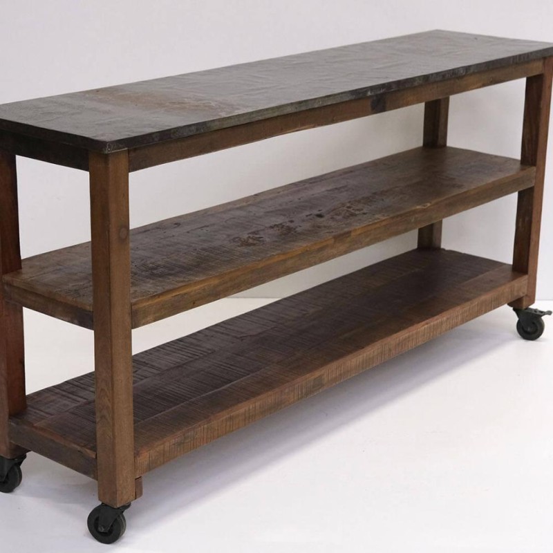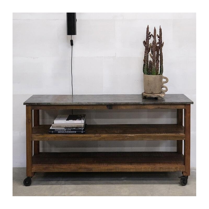 Konsolbordet "Chagna" fra Trademark Living kombinerer et råt, industrielt udtryk med praktisk funktion. Bordpladen i robust metal giver en slidstærk overflade, mens de solide hjul gør det let at flytte rundt efter behov. Bordet er perfekt som konsol- eller skænk og tilfører ethvert rum et unikt præg og masser af personlig karakter.