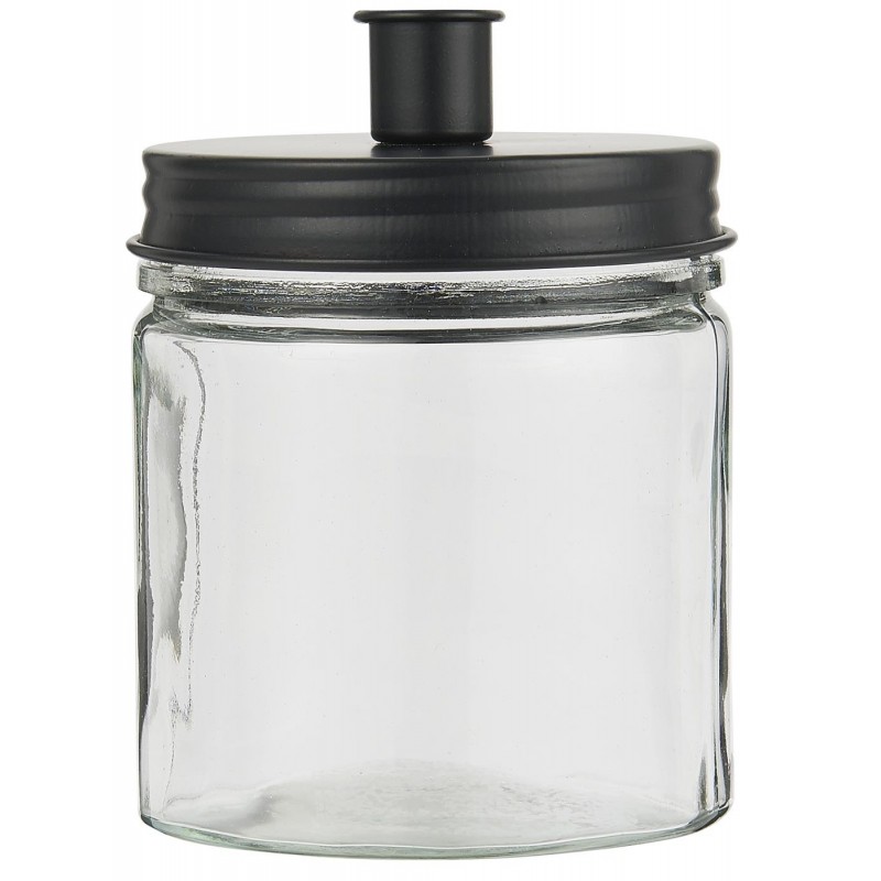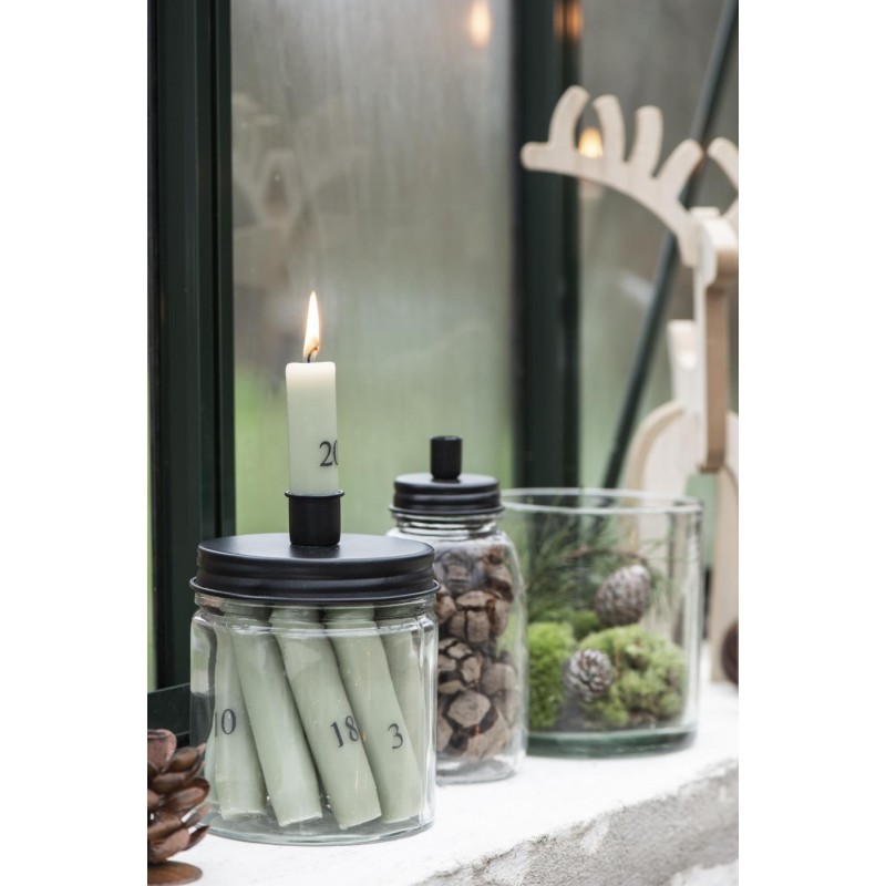 Sød glasstage til bedelys med sort låg fra Ib Laursen. Stagen er en glaskrukke med et hvidt metallåg oven på, hvori der kan sættes et bedelys. Nede i krukken kan du lave en fin dekoration eller du kan vælge at opbevare flere bedelys. Låget er også rigtig fint at dekorere f. eks. med et bånd og lidt gran. Stages fås i flere farver.