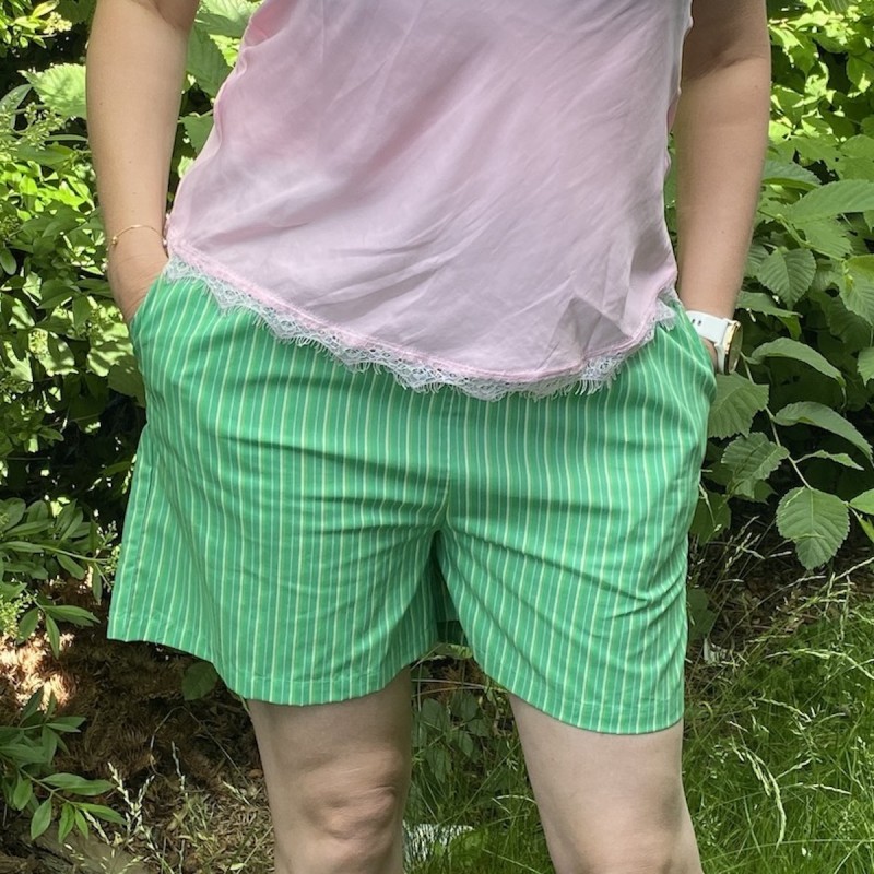 Lækre og behagelige shorts af bomuld, NettySZ fra Saint Tropez. Shortsene er grønne med lysegrønne og cremefarvet striber. De har elastik i taljen og lommer. Shortsene er helt perfekte når det bliver rigtig varmt, både til strandturen, en eftermiddag i haven eller til en dag på jobbet.