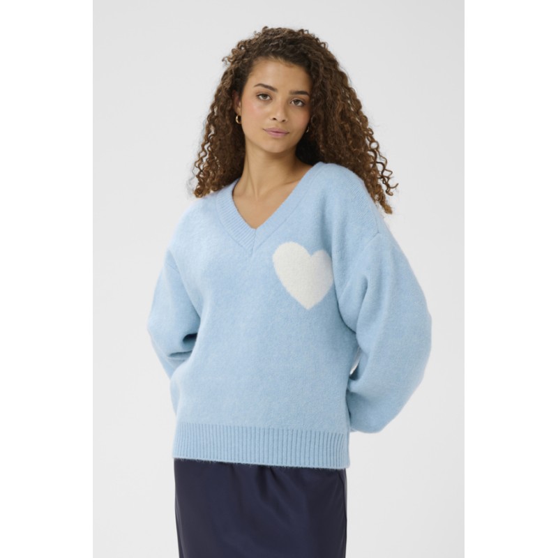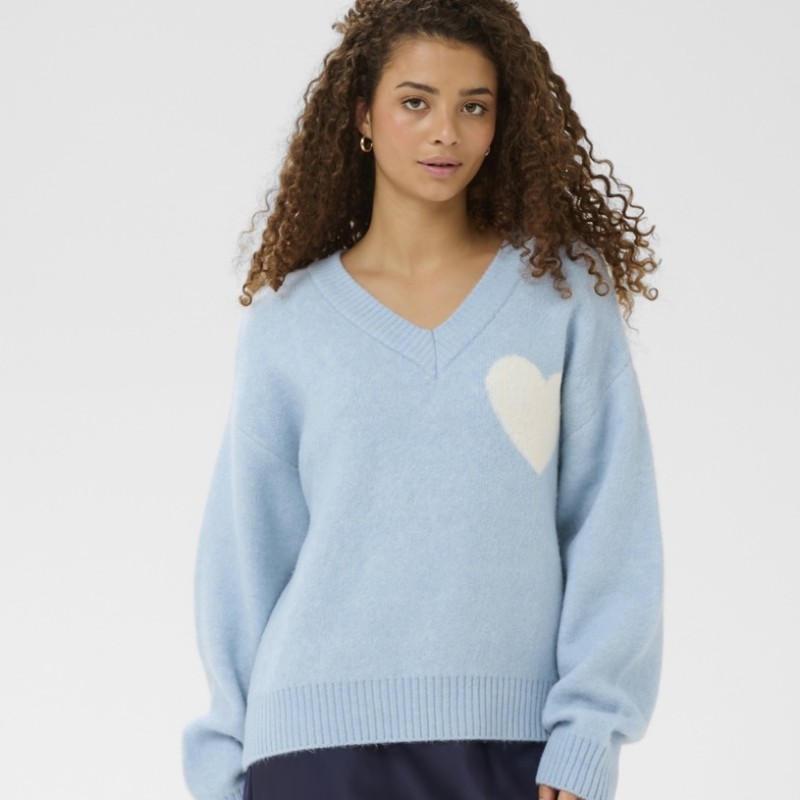 Giv din garderobe et fint og stilfuldt løft med "PariaSZ" striktrøjen fra Saint Tropez. Denne bløde, lysblå strik prydes af et charmerende hvidt hjerte på brystet, der tilføjer en feminin detalje. Perfekt til både hverdag og afslappede dage, kombiner den med jeans eller nederdel og hvide sneakers