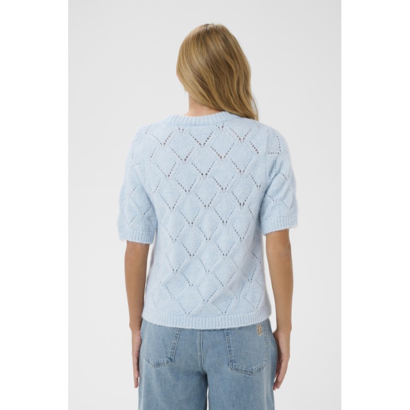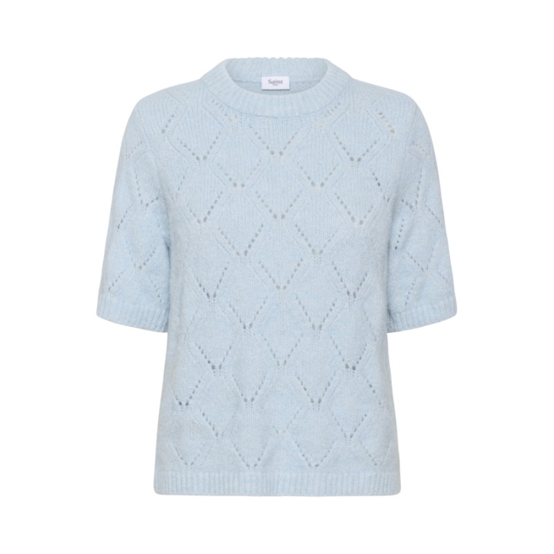 Opdag komfort og stil med "PavaaniSZ" striktrøjen fra Saint Tropez. Denne lyseblå kortærmede pullover imponerer med sit delikate diamantmønster og en afslappet, lige pasform. Den ribstrikkede halsudskæring samt ribkanter tilfører et elegant touch – perfekt til både hverdagslook og mere pyntede anledninger.