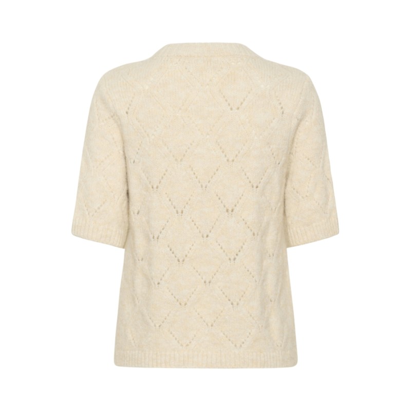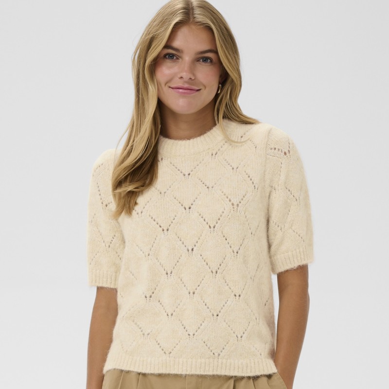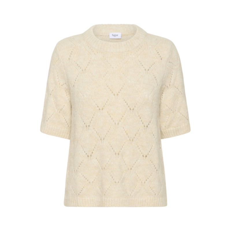 Opgrader din garderobe med "PavaaniSZ" striktrøjen fra Saint Tropez. Denne råhvide pullover har korte ærmer og et elegant, åbent diamantmønster for et feminint udtryk. Trøjens afslappede pasform, lige silhuet samt ribstrikkede kanter og rund hals sikrer både komfort og stil til enhver anledning.