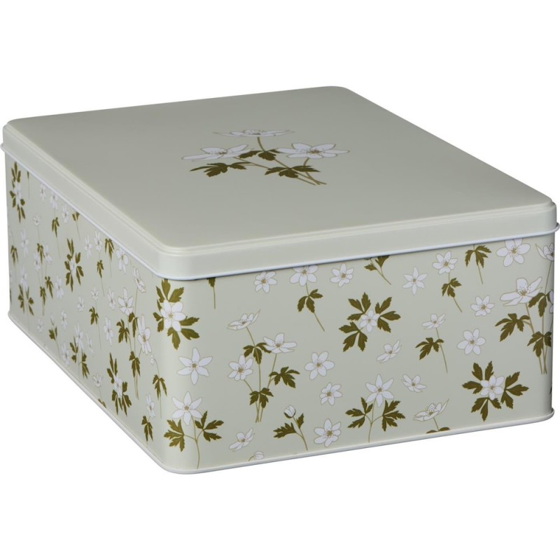 Flad og rummelig dåse med fine anemoner og hvidt låg fra Ib Laursen. Dåsen er fuldfarvet offwhite indeni og passer perfekt til opbevaring af kager, snacks eller andet bagværk. Kan også bruges som en dekorativ og funktionel løsning på kontoret eller krea rummet.