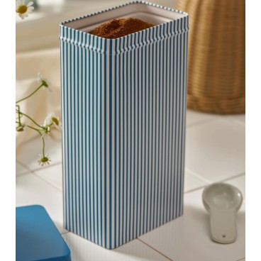 Er du på udkig efter noget hyggeligt til opbevaring? Høj og praktisk dåse med blå striber og blåt låg fra Ib Laursen. Dåsen er fuldfarvet offwhite indeni, hvilket giver et klassisk og harmonisk udtryk. Perfekt til opbevaring af spaghetti, grissini eller andre tørvarer, samtidig med at den pynter i køkkenet. Se flere dåser