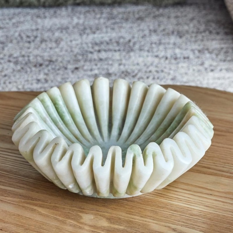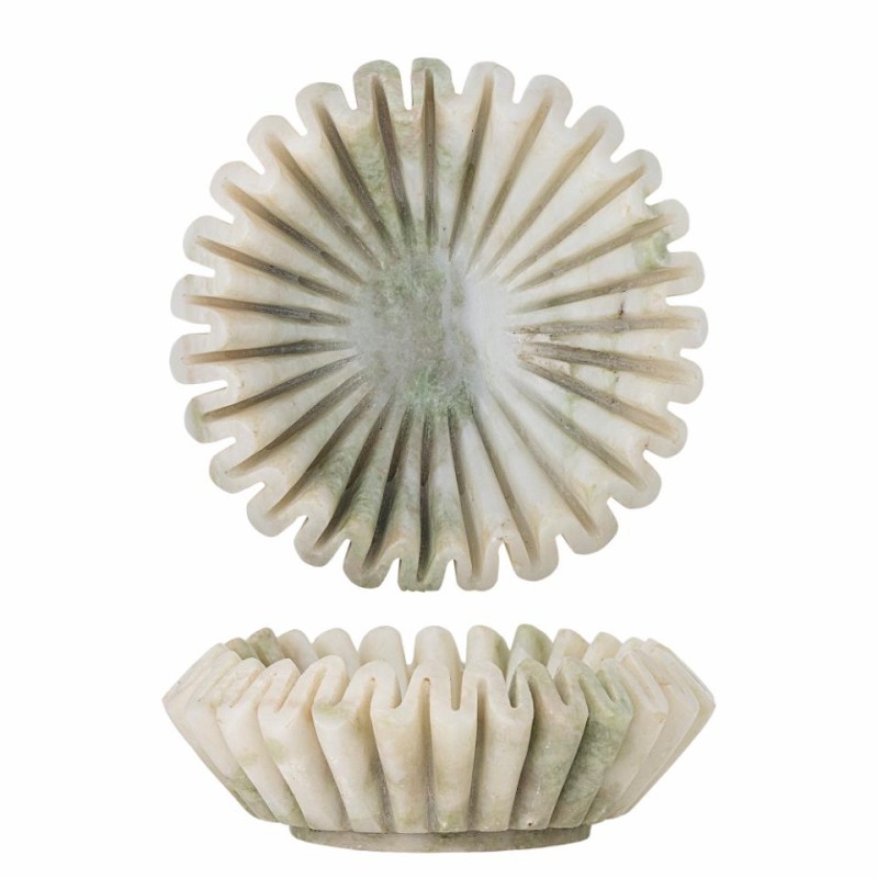 Harmonia skålen fra Bloomingville er en elegant og skulpturel marmor-skål i smukke hvide og grønne nuancer. Med sin polerede overflade, tydelige åretegninger og plisserede kanter tilføjer den et raffineret udtryk til enhver indretning. Hver skål er unik takket være det naturlige marmors variation i farve og struktur, et eksklusivt designstykke med karakter