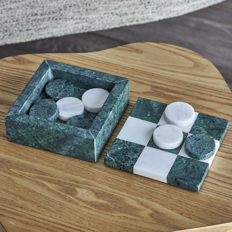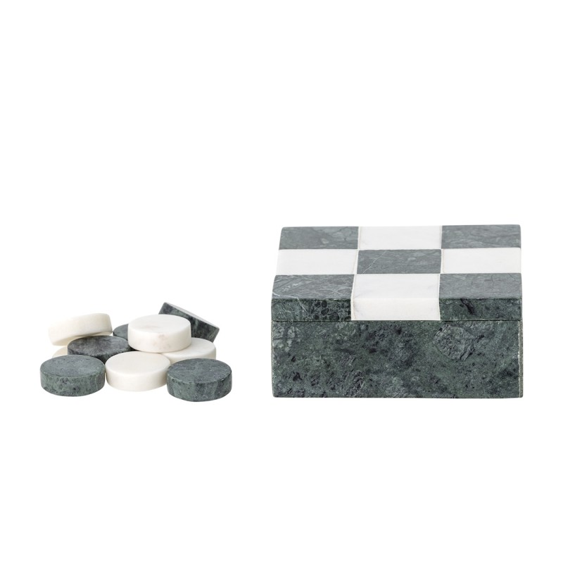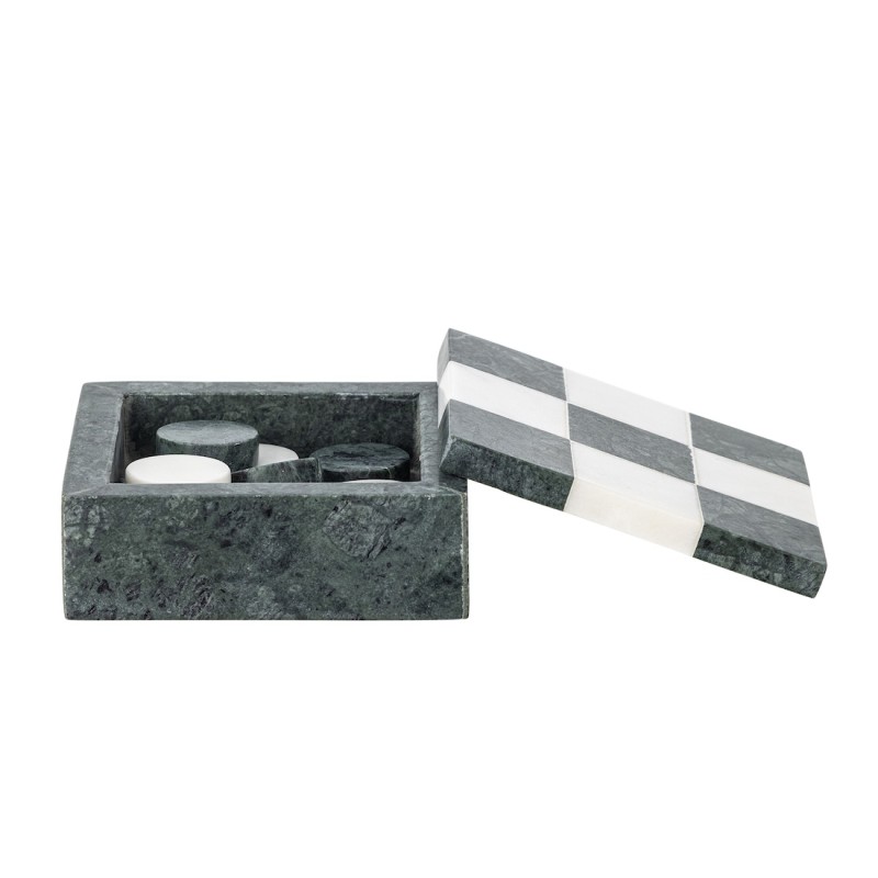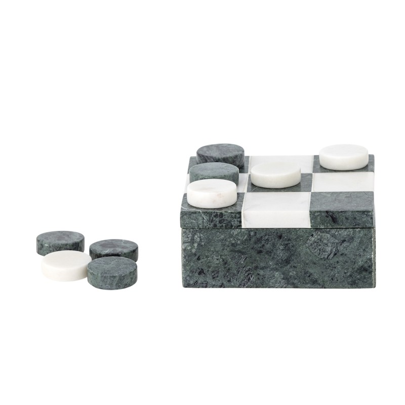 Aske Kryds & Bolle fra Bloomingville er et elegant og dekorativt spilsæt i poleret grøn marmor med låg dekoreret i bløde, hvide og grønne tern. Spillebrikkerne opbevares nemt inde i æsken, hvilket gør det praktisk såvel som stilfuldt. Lavet af naturmaterialer, hvert sæt har unikke farvevariationer for et personligt præg.