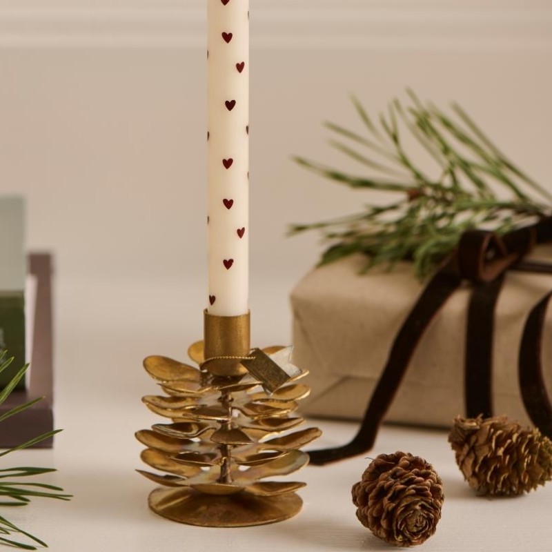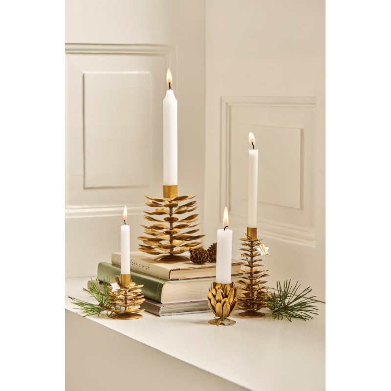 Skab hyggelig julestemning med den fine "Gloria" kogle stage fra Ib Laursen. Stagen er 6,5 cm høj og formet som en naturtro kogle i messing. Den passer perfekt til kertelys og tilfører varme og charme til det dækkede julebord – gerne flere samlet for ekstra effekt. Findes også i modeller til krone- eller bedelys.