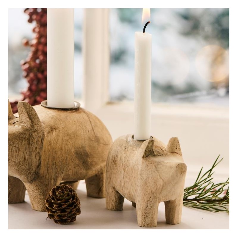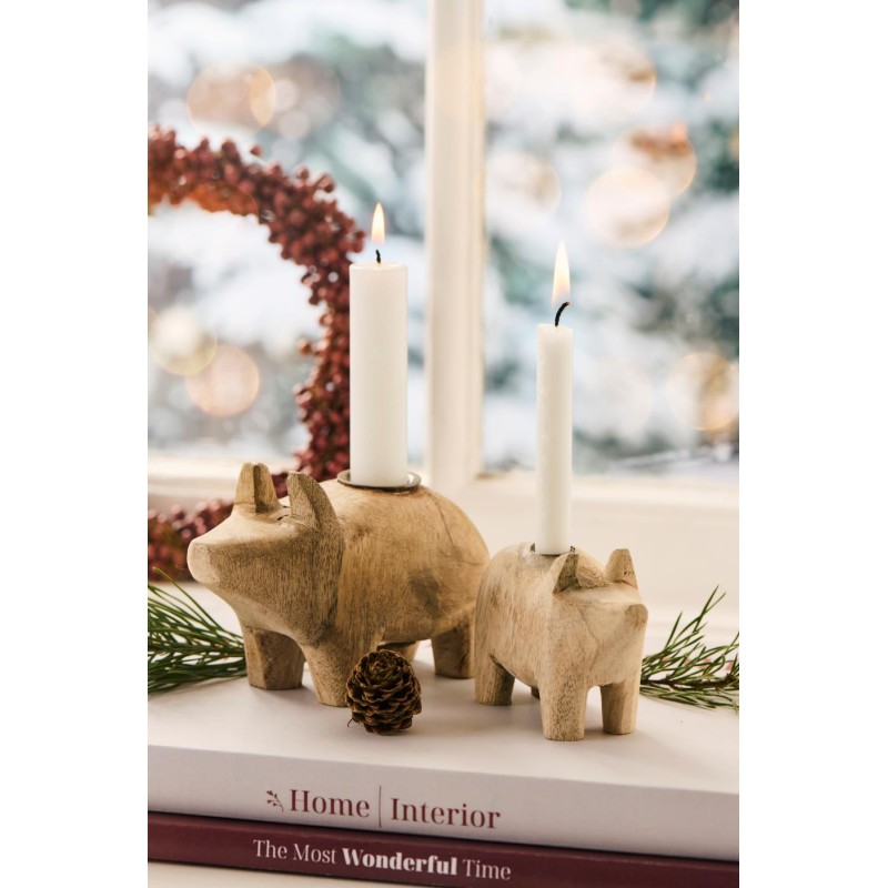 Tilføj charme og varme til din indretning med denne unikke lysestage formet som en gris fra Ib Laursen. Fremstillet i genbrugstræ, hvilket gør hver stage helt unik i udtryk og karakter. Perfekt til kertelys – især smuk i juletiden, gerne sammen med den anden trægris eller hesten for et hyggeligt og personligt helhedsudtryk.