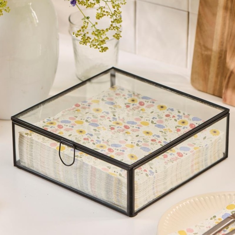 Glasæske med låg og metalkanter, kvadratisk fra Ib Laursen. Glasæsken har et fint og enkelt design der gør den flot at have stående fremme. Brug den til dine servietter på spisebordet - eller til småting som smykker og perler.