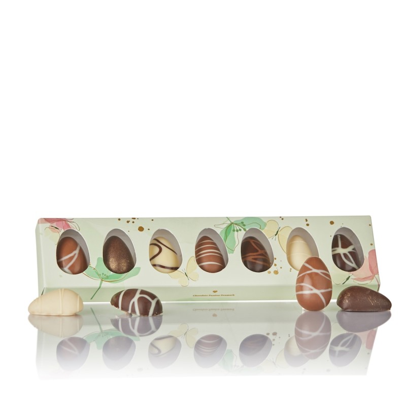 Forkæl dig selv eller én du holder af med denne smukke gaveæske fra Cocoture. Den grønne aflange æske er dekoreret med fine blomster og indeholder 3 lækre marcipanæg samt 4 fyldte chokoladeæg. Perfekt som en sød påskegave, værtindehilsen eller lille luksus til kaffebordet. Kvalitet og smag går hånd i hånd hos Cocoture!