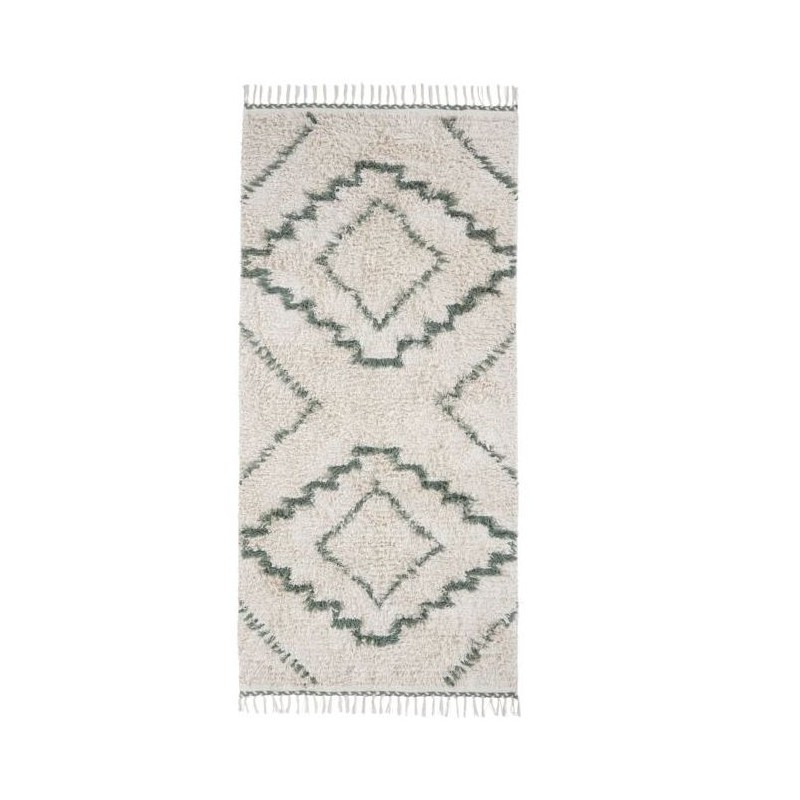 Er dit gulv lidt kedeligt at se på? Kunne dette råhvide tæppe med det enkle og smukke grønne, geometriske mønster og frynserne fra House Doctor være noget for dig. Tæppet måler 90x200 cm, så det passer godt ind i de fleste rum, både som løber ned ad gange eller for enden af sengen eller måske ved sofabordet.
