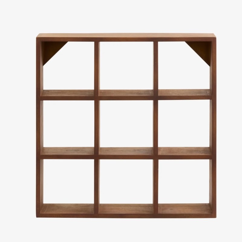 Vis dine yndlingskopper eller små nips frem med OSSA kophylde fra Nordal. Den firkantede hylde måler 40x40 cm og har ni fine rum, perfekt til både opbevaring og dekoration. Udført i mangotræ med en mat lakeret finish, der fremhæver træets smukke åretegninger og tilfører varme til din vægindretning – alene eller sammen med flere moduler.