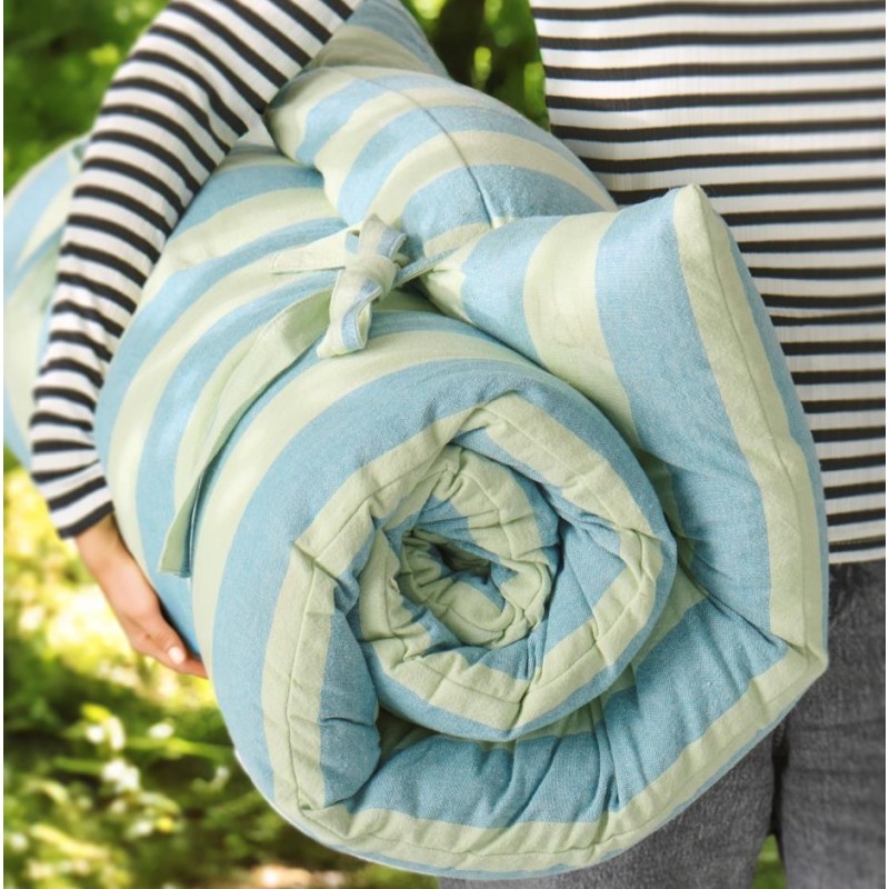 Madras Linus fra Ib Laursen er en komfortabel og stilfuld løsning til loungen. Den tykke polstring og det bløde bomuldsstof giver høj sidde- og liggekomfort, mens de lysegrønne og blå striber tilfører et afslappet udtryk. Perfekt til solsenge, bænke eller gulvet – nem at rulle sammen efter brug.