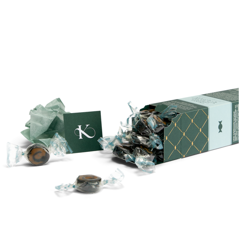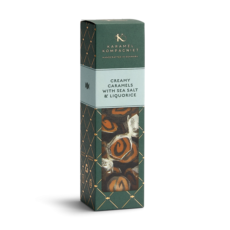 Forkæl smagsløgene med Karamel Kompagniets flødekarameller med havsalt og lakrids. Den perfekte balance mellem sød, cremet karamel og intens lakridssmag løftes af sprøde saltkrystaller fra Læsø Sydesalt. Hver bid er håndlavet for at sikre en uimodståelig gourmetoplevelse på højeste niveau – ideel som selvforkælelse eller gaveidé!