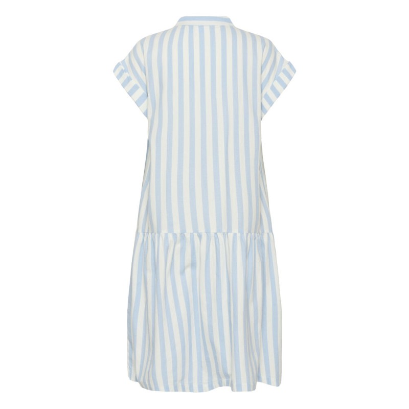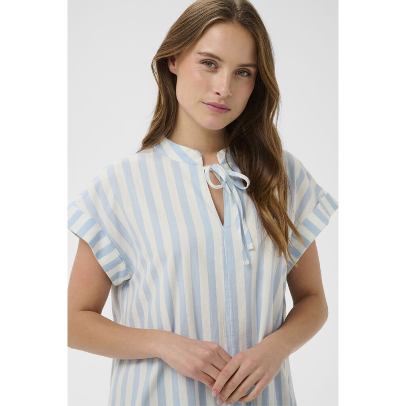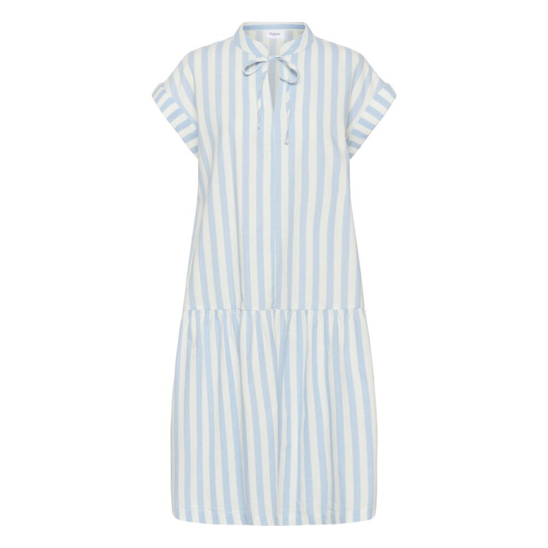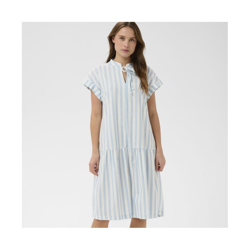 Saint Tropez kjolen ZalindaSZ har et let og luftigt udtryk med lyseblå og hvide striber. Den er designet i en lige, løs pasform med korte ærmer, lille opretstående krave samt nøglehulsåbning foran med bindebånd. En enkel og feminin kjole til både hverdag og sommerlige anledninger.
