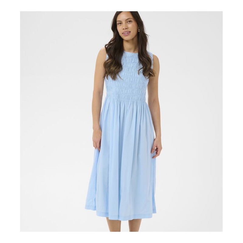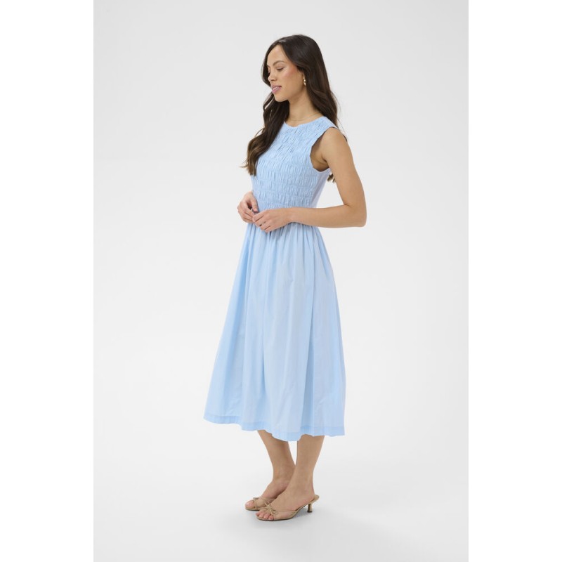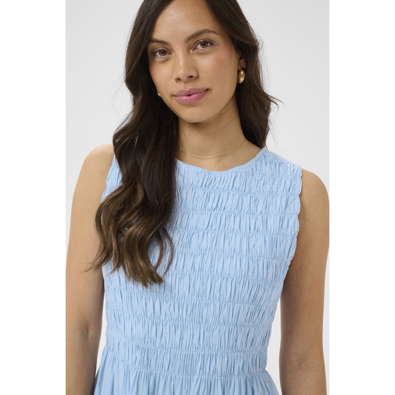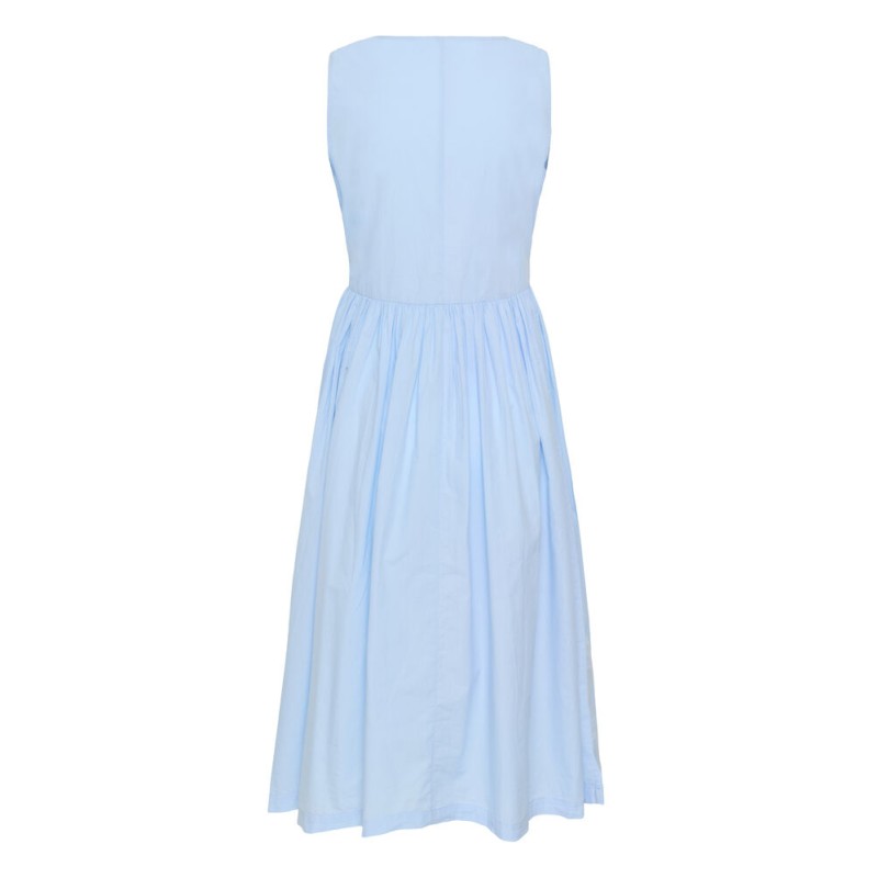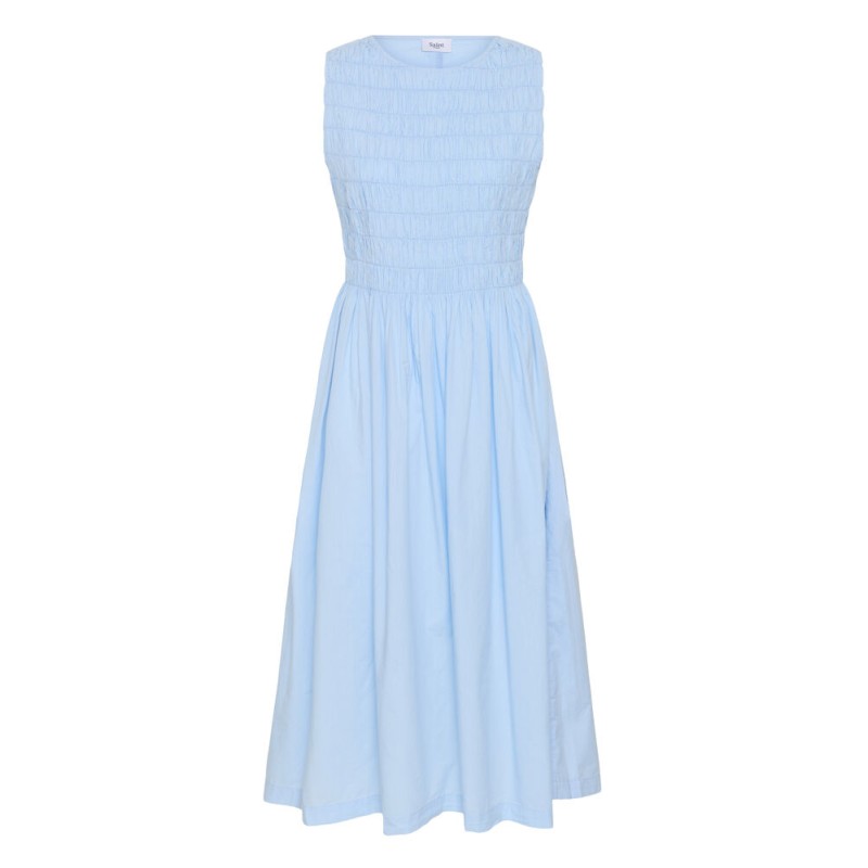 Kjolen RosagislaSZ fra Saint Tropez i klar blå er en stilren, ærmeløs model med tætsiddende overdel og fine rynkedetaljer. Den runde halsudskæring og det let vide skørt giver et elegant fald til midt på læggen. Et enkelt design uden synlige udsmykninger, der passer perfekt til både hverdag og fest.