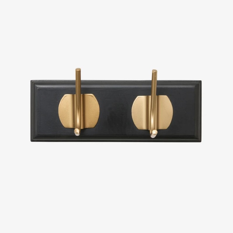 EDGY knagerække fra Nordal i sort kombinerer stil og funktion med de to gyldne knager. Den fine størrelse gør den ideel til entré, soveværelse eller badeværelse, hvor pladsen er trang. Den klassiske sorte farve og de varme messingfarver skaber et moderne udtryk, en elegant vægløsning der tilfører både karakter og praktisk opbevaring på minimal plads