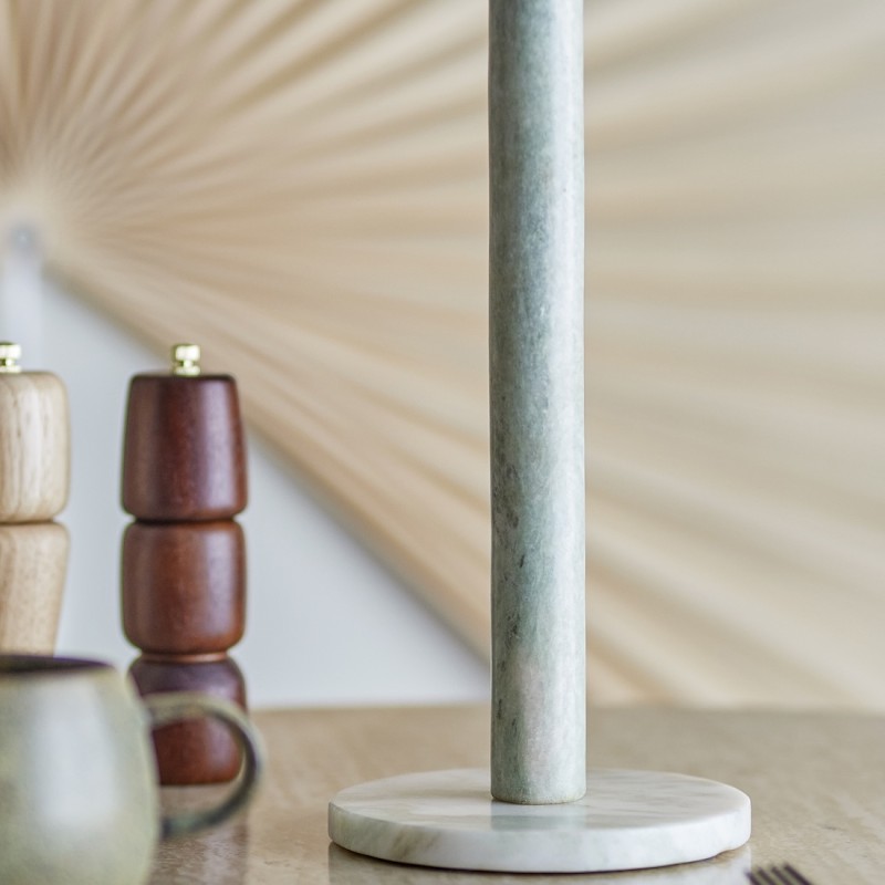 Emy køkkenrulleholder fra Bloomingville kombinerer funktionalitet og æstetik i et elegant design. Den er fremstillet af poleret marmor med en beige fod prydet af naturlige åretegninger samt en cylinderformet stang i blid grøn nuance. Hver holder er unik – et stilfuldt og karakterfuldt indslag til dit køkken.
