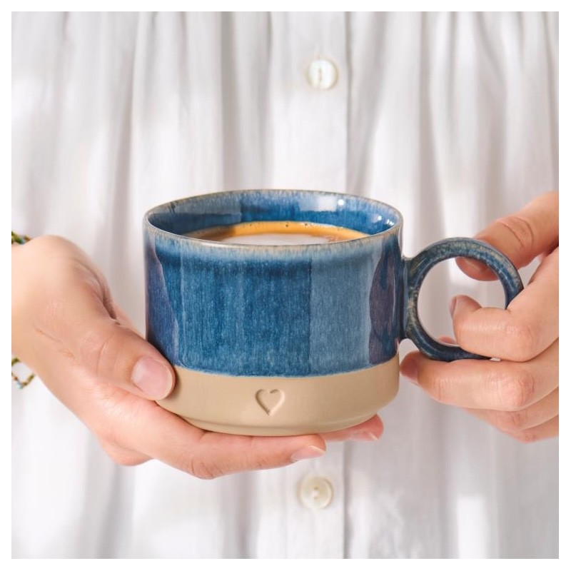 Nyd dine kaffepauser med dette smukke stentøjskrus fra Ib Laursen. Krusets matte lerlook kombineres flot med en elegant blå kant og et indpræget hjerte, der tilfører charme og personlighed. Den praktiske hank gør det behageligt at holde om kruset – ideelt til varme drikke i hyggelige stunder eller som gaveidé til en du holder af.