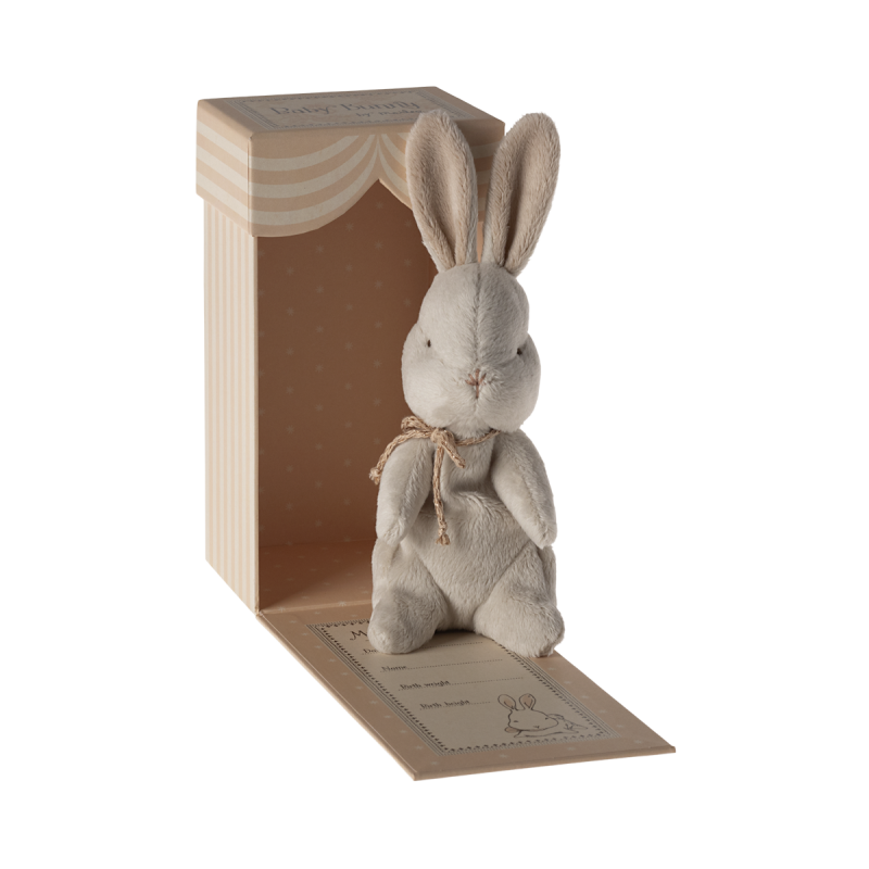 Denne søde "Min første kanin" fra Maileg er den ideelle gave til en lille ny baby. Den bløde plyskanin i rosa ske passer perfekt i små hænder og har et charmerende bånd om halsen. Leveres i en smuk gaveæske med plads til personlige fødselsoplysninger – en skøn babyshower-gave, der vil blive værdsat for livet.