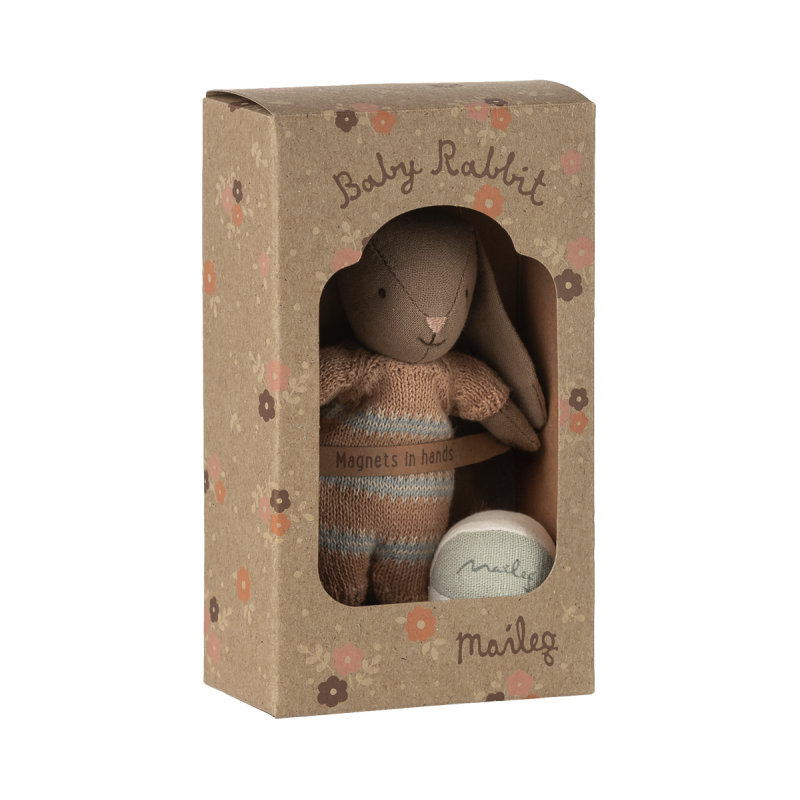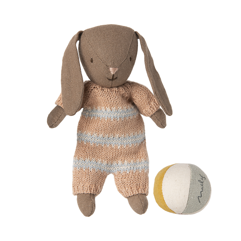 Sød og charmerende kanin sæt micro i brun med rosa strik tøj med striber og en lille bold fra Maileg. Den bløde kanin har praktiske magneter i hænderne, så den nemt kan holde fast i tilbehør – perfekt til fantasifuld leg. Et ideelt startsæt for små samlere eller som gaveidé, der inviterer børn ind i Mailegs magiske univers fuld af eventyr og kreativitet. Se udvalget af Maileg kaniner