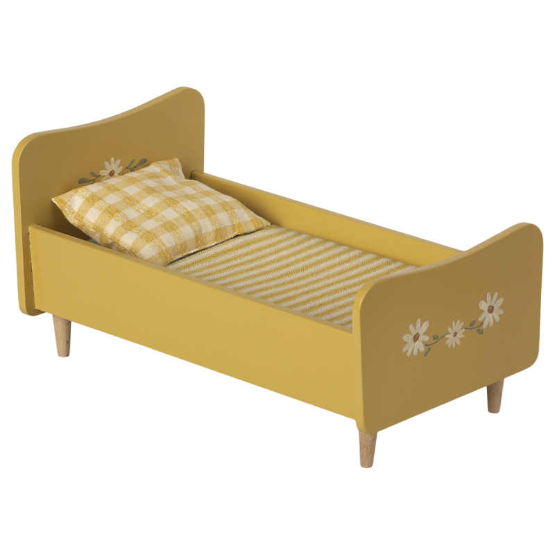 Forkæl dine små Maileg-venner med denne charmerende gule træseng i miniaturestørrelse. Sengen passer perfekt til kaniner i størrelse 1 og 2, og de fine håndmalede detaljer gør hver seng unik. Medfølgende blødt sengetøj syet af unikke stoffer skaber en hyggelig soveplads, hvor din lille ven kan drømme sødt hele natten igennem.