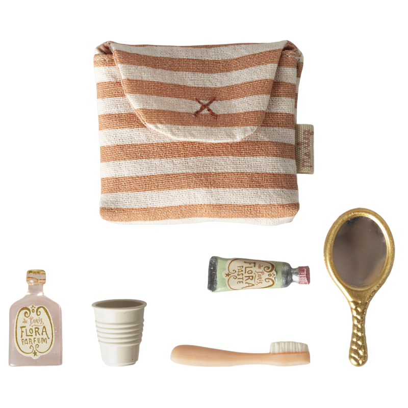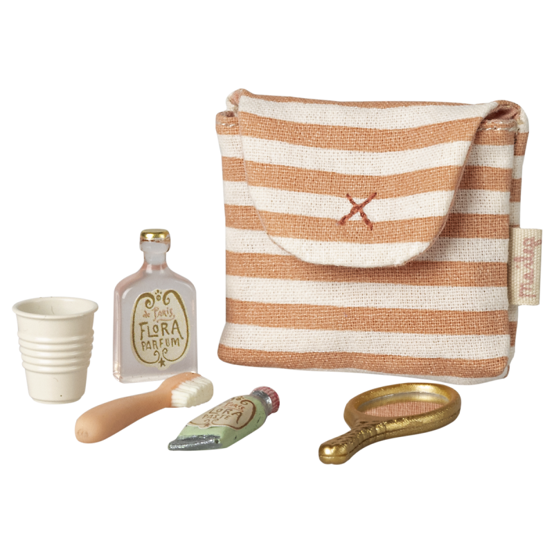 Maileg tandbørste-sættet til mus kommer i en charmerende stribet toilettaske og indeholder alt til de daglige badeværelsesrutiner. Sættet rummer tandbørste, kop, spejl, creme og parfume – perfekt som fint tilbehør til fantasifuldt rollespil for små Maileg-mus.