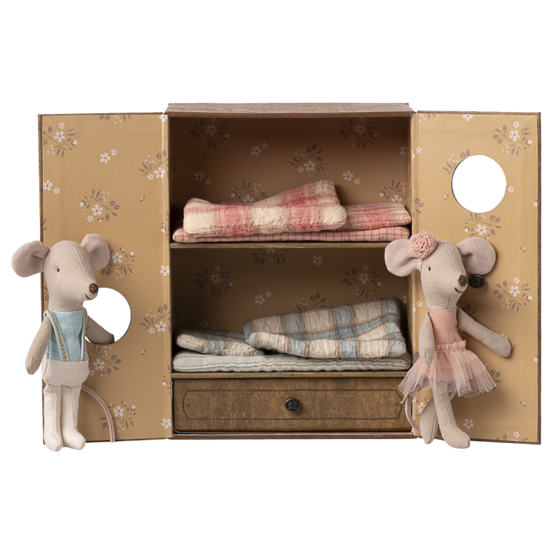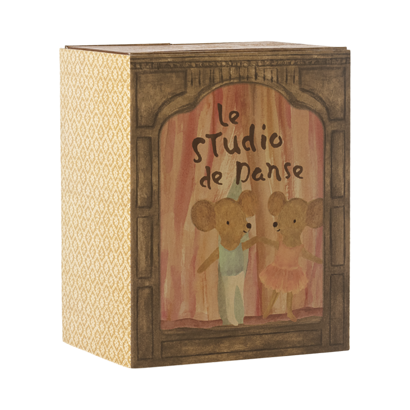 Træd ind i en fortryllende verden med Mailegs Ballet mus i dansestudie, inklusiv lillesøster og lillebror. Den dekorative æske fungerer både som et hyggeligt musehjem og et elegant dansestudie. De to søde mus er klædt klar til ballet – perfekte til fantasifuld leg fyldt med stjernedrys, bevægelse og magi!
