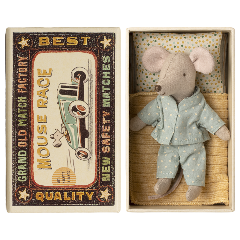 Lillebror mus i prikket tøj og tændstikæske fra Maileg er en elskelig klassiker. Musen er perfekt til fantasifuld leg og sover trygt i sin fine æske med blødt sengetøj og unikke print. Alt er lavet af kvalitetsmaterialer med sans for detaljer – ideel som gave eller samlerobjekt for både børn og voksne.