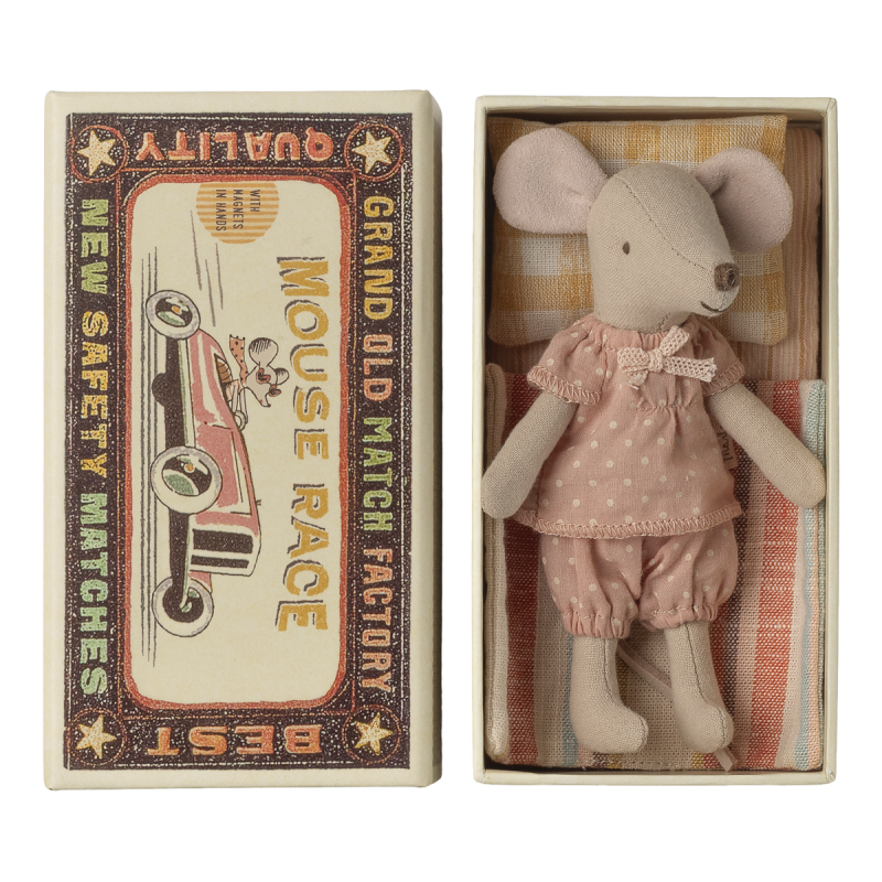 Storesøster mus i tændstikæske fra Maileg er en charmerende klassiker, der vækker fantasien til live. Hun kommer klædt i yndigt rosa tøj med fine prikker og bor hyggeligt i sin lille tændstikæske fyldt med blød dyne og pude. Med magneter i hænderne kan hun holde fast på sine små accessories – perfekt til leg, hygge eller som samlerobjekt for både børn og voksne.