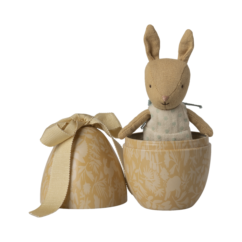 Dette smukke påskeæg fra Maileg gemmer en sød overraskelse – en mikro kanin klædt i sin fineste dragt. Ægget er lavet af metal, dekoreret med et delikat mønster og pyntet med en blød sløjfe på toppen. Kaninen er iført prikket dragt og har små magneter i hænderne, så den kan holde om ægget. En charmerende gaveidé til børn.