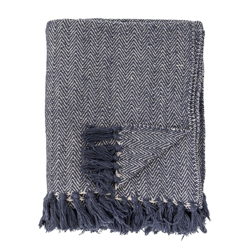 Tilføj et strejf af klassisk elegance til din indretning med Herringbone plaiden fra Bloomingville. Vævet i genanvendt bomuld og designet i smuk mørkeblå og råhvid med tidløst sildebensmønster, bringer den både stil og bæredygtighed ind i hjemmet. Perfekt til afslapning på sofaen eller som dekorativt element.