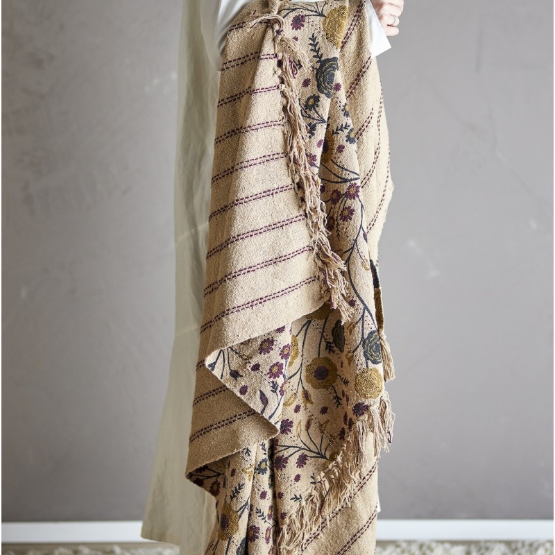 Eydis plaiden fra Bloomingville er vævet i genanvendt bomuld og kombinerer smukt design med bæredygtighed. Den ene side prydes af et blomstermønster i varme nuancer, mens bagsiden har fine vævede striber. Med dekorative frynser i enderne er den både blød, hyggelig og perfekt til hjemmet!