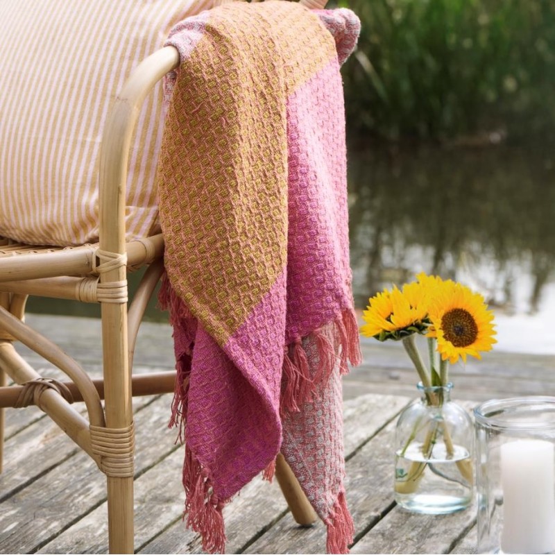 Tilføj farve og hygge til dit hjem med denne smukke plaid fra Ib Laursen. Tæppet måler 130x160 cm og har et levende stribemønster i pink, orange, natur og gule nuancer – perfekt til sofaen eller udendørs brug på kølige aftener. Det bløde materiale giver komfort og stil i ét – en dekorativ detalje der lyser ethvert rum op.