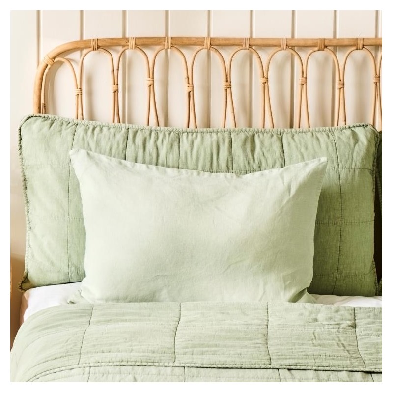Giv soveværelset et elegant løft med dette quiltede pudebetræk til gavlpude fra Ib Laursen. Forsiden har en smuk, vatteret struktur i den støvede grønne nuance "Pistacie", der minder om eucalyptusblade. Bagsiden lukkes med fine bindebånd, som fuldender det stilfulde udtryk. Måler 50x90 cm og passer perfekt til både sofa og sengerygning.