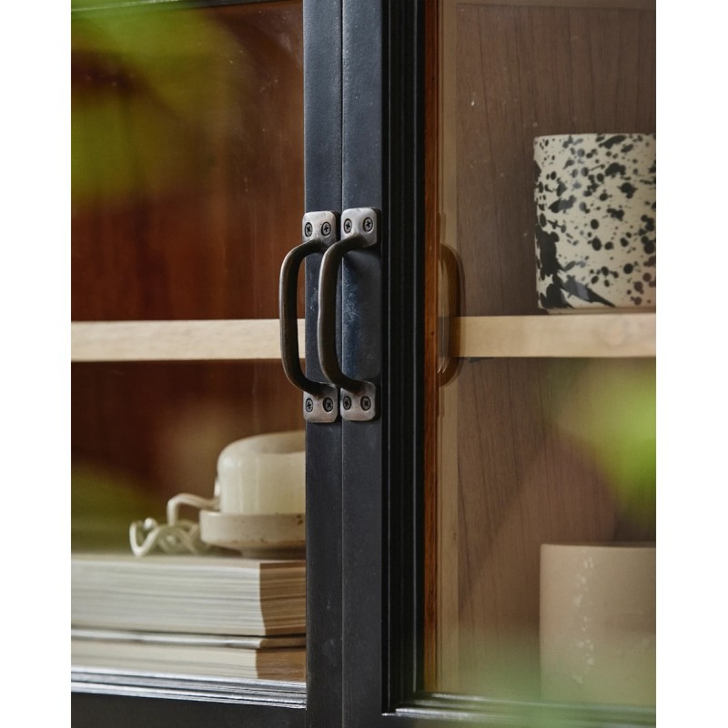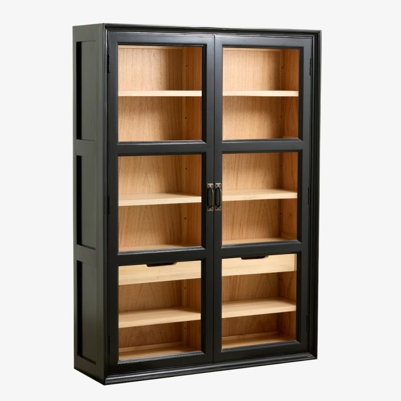 Det væghængte VIVA vitrineskab fra Nordal i sortlakeret gmelina-træ forener elegance og funktionalitet. Med to glaslåger, tre flytbare hylder, samt to skuffer giver det fleksibel opbevaring til alt fra køkkenartikler til dekorative elementer. Den varme træbagside tilfører en smuk kontrast – ideel til både stue, entré eller spisestue.