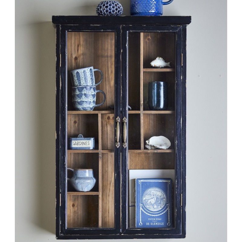 Hazem skabet fra Bloomingville er et smukt og funktionelt opbevaringsmøbel i sortmalet fyrretræ med patineret finish. De forskudte hylder giver fleksibel indretning, mens glaslågerne i hærdet glas tilføjer lethed og elegance. Skabet fungerer både som rumdeler og dekorativt møbel – hver model har unikke farvevariationer.