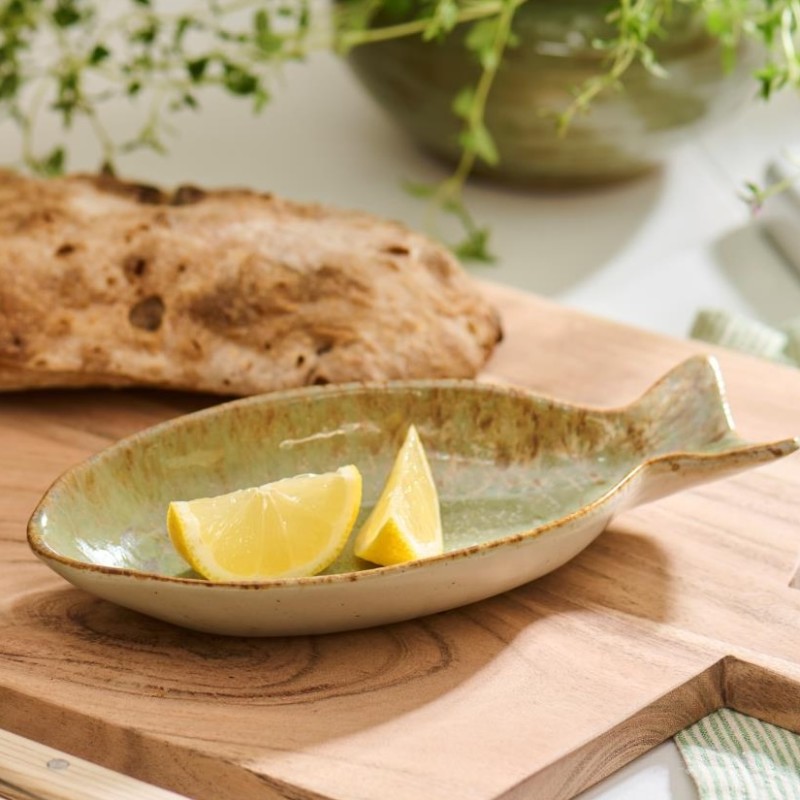 Bring havets charme ind i dit hjem med den fiskeformede "Ocean Green" skål fra Ib Laursen. Med sin unikke, reaktive glasur og smukke grønne nuancer får hver skål sit helt eget udtryk. Den karakteristiske form giver et legende maritimt islæt til borddækningen – ideel både som serveringsskål eller dekorativ detalje i din boligindretning.