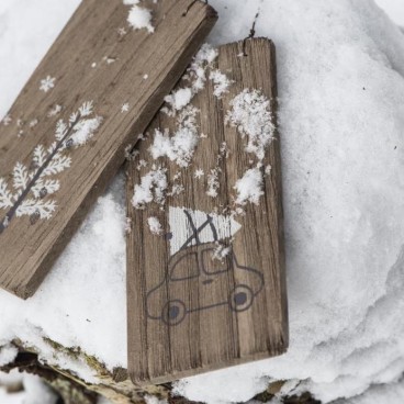 Sødt lille skilt fra Ib Laursen. Skiltet er lavet af træ og har en snor så det kan hænge. På skiltet er der malet en bil med et juletræ på taget. Super fint at hænge på din dør eller i din stue. Skiltet fås i flere varianter.