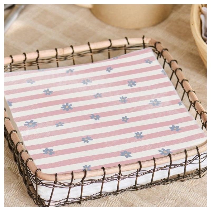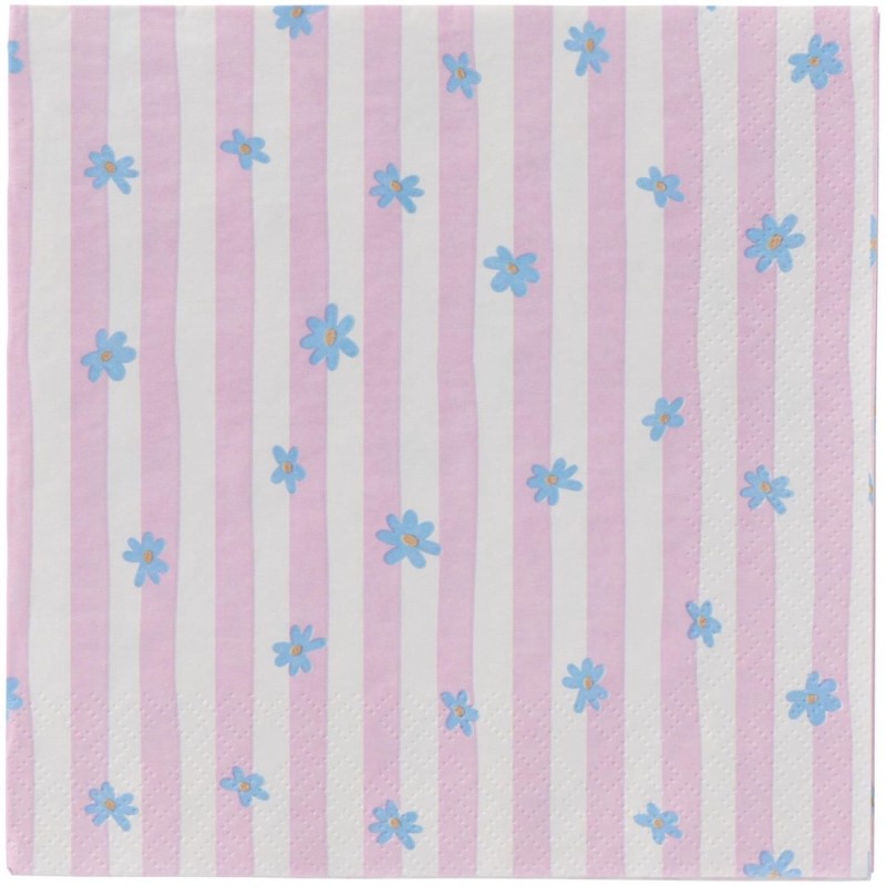 Tilføj et strejf af romantik og charme til din borddækning med disse smukke servietter fra Ib Laursen. Pakken indeholder 20 kvadratiske papirservietter dekoreret med fine blå blomster og lyserøde striber – perfekt til fester, brunch eller hyggelige sammenkomster. Skab en stemningsfuld atmosfære med dette feminine og elegante design.