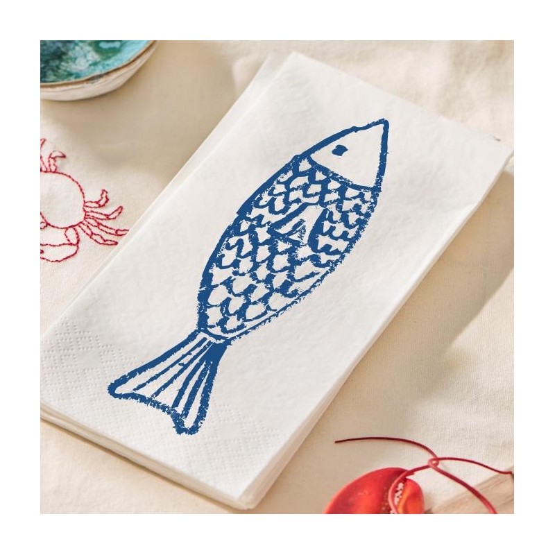 Tilfør et maritimt touch til borddækningen med disse charmerende servietter fra Ib Laursen. Pakken indeholder 16 aflange servietter, dekoreret med en fin blå fisk – perfekte til både hverdag og festlige lejligheder. Skab en hyggelig stemning ved middagsbordet eller som en del af sommerens strandinspirerede opdækning.
