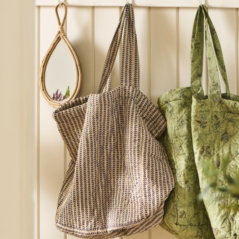 Denne fine quiltede taske fra Ib Laursen er både praktisk og stilfuld. Designet med et unikt mønster af mørkeblå stængler, tilføjer den et elegant touch til dit outfit. Tasken har god plads til hverdagens nødvendigheder og er ideel som shoppingtaske eller strandtaske. Den bløde bomuldskvalitet giver ekstra komfort